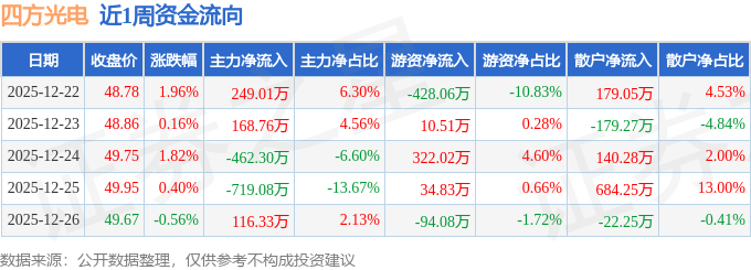 资金流向数据方面,本周四方光电主力资金合计净流出647.28万元,游资资金合计净流出154.79万元,散户资金合计净流入802.06万元。本周资金流向一览见下表: