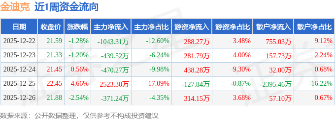 资金流向数据方面,本周金迪克主力资金合计净流入198.96万元,游资资金合计净流入1194.65万元,散户资金合计净流出1393.61万元。本周资金流向一览见下表: