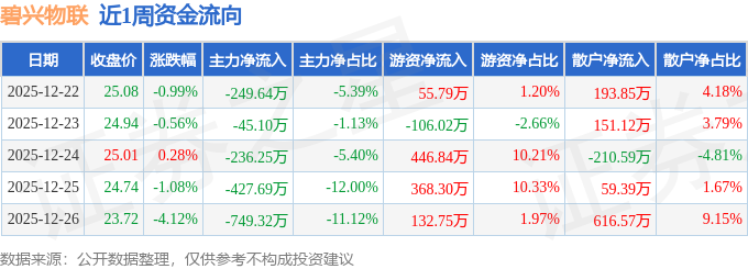 证券之星消息,截至2025年12月26日收盘,碧兴物联(688671)报收于23.72元,较上周的25.33元下跌6.36%。本周,碧兴物联12月22日盘中最高价报25.75元。12月26日盘中最低价报23.68元。碧兴物联当前最新总市值19.45亿元,在环保设备板块市值排名25/27,在两市A股市值排名5091/5181。