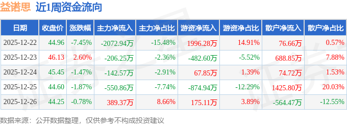 资金流向数据方面,本周益诺思主力资金合计净流出2583.27万元,游资资金合计净流入881.7万元,散户资金合计净流入1701.56万元。本周资金流向一览见下表: