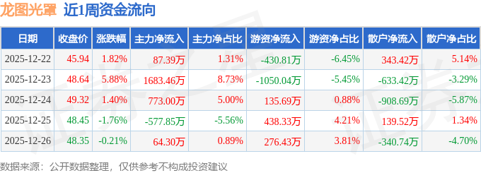 资金流向数据方面,本周龙图光罩主力资金合计净流入2030.3万元,游资资金合计净流出630.39万元,散户资金合计净流出1399.91万元。本周资金流向一览见下表: