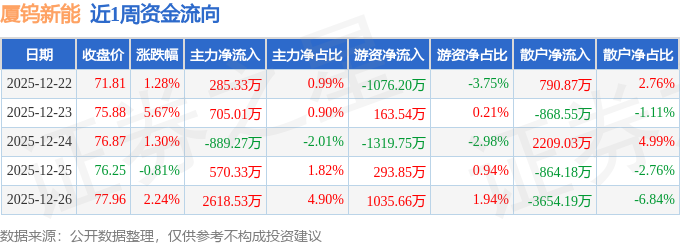 沪深股通持股方面,截止2025年12月26日收盘,厦钨新能沪股通持股数为98.08万股,占流通股比为23.0%。