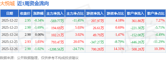 资金流向数据方面,本周大悦城主力资金合计净流出687.97万元,游资资金合计净流入637.38万元,散户资金合计净流入50.59万元。本周资金流向一览见下表:
