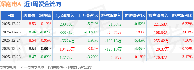证券之星消息,截至2025年12月26日收盘,深南电A(000037)报收于8.47元,较上周的8.52元下跌0.59%。本周,深南电A12月22日盘中最高价报8.58元。12月24日盘中最低价报8.39元。深南电A当前最新总市值49.91亿元,在电力板块市值排名82/102,在两市A股市值排名3367/5181。