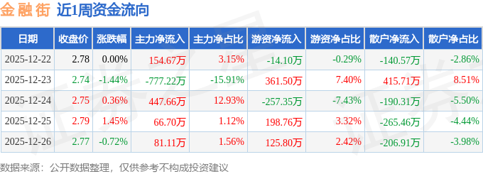 资金流向数据方面,本周金 融 街主力资金合计净流出27.08万元,游资资金合计净流入414.62万元,散户资金合计净流出387.54万元。本周资金流向一览见下表: