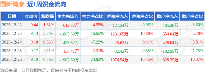 资金流向数据方面,本周国新健康主力资金合计净流出3494.02万元,游资资金合计净流入2171.85万元,散户资金合计净流入1322.16万元。本周资金流向一览见下表: