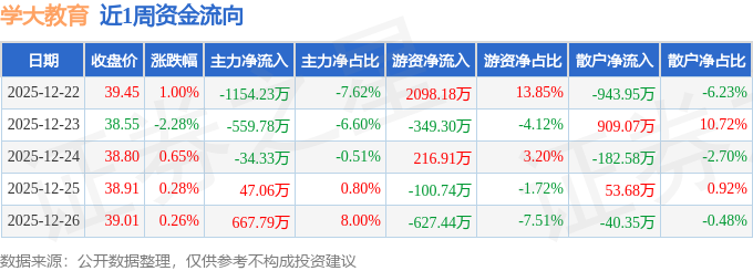 沪深股通持股方面,截止2025年12月26日收盘,学大教育深股通持股数为49.09万股,占流通股比为41.0%。