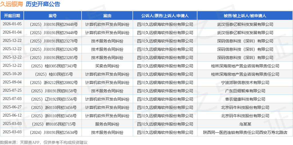 案号:(2025)川0191民初29448号根据统计,近一年内以四川久远银海软件股份有限公司为当事人的历史开庭公告有14则,其中案由为“计算机软件开发合同纠纷”的公告以7则居首,其次为“技术服务合同纠纷”有5则,“买卖合同纠纷”有1则。历史开庭公告如下: