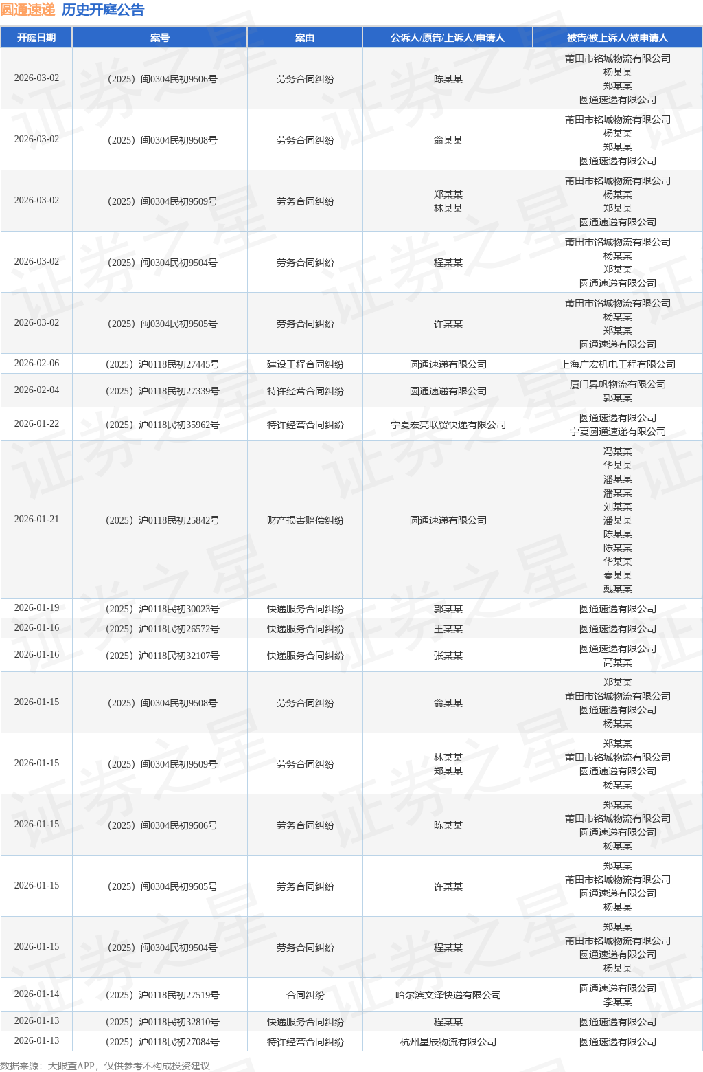 案号:(2025)浙0113民初23195号根据统计,近一年内以圆通速递有限公司为当事人的历史开庭公告有177则,其中案由为“快递服务合同纠纷”的公告以41则居首,其次为“特许经营合同纠纷”有24则,“非机动车交通事故责任纠纷”有16则。历史开庭公告(前20条)如下: