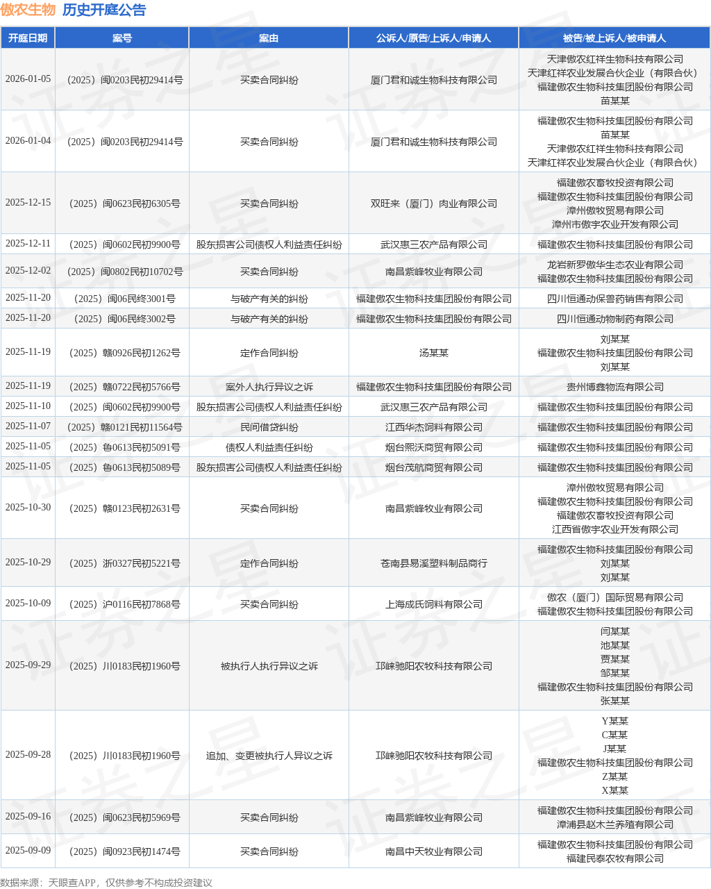 案号:(2025)闽0203民初29414号根据统计,近一年内以福建傲农生物科技集团股份有限公司为当事人的历史开庭公告有93则,其中案由为“买卖合同纠纷”的公告以38则居首,其次为“与破产有关的纠纷”有16则,“金融借款合同纠纷”有13则。历史开庭公告(前20条)如下: