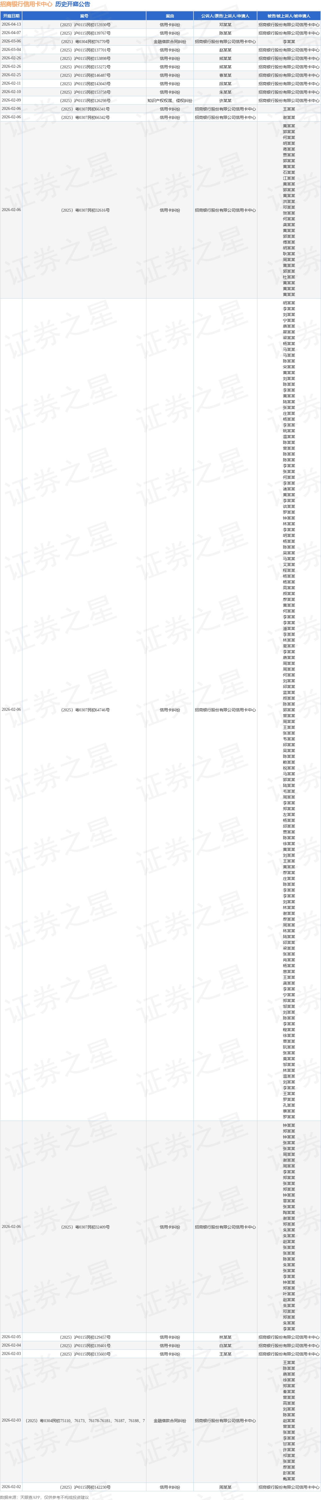 案号:(2025)辽0106民初14509号根据统计,近一年内以招商银行股份有限公司信用卡中心为当事人的历史开庭公告有11200则,其中案由为“信用卡纠纷”的公告以9190则居首,其次为“金融借款合同纠纷”有1890则,“小额借款合同纠纷”有30则。历史开庭公告(前20条)如下: