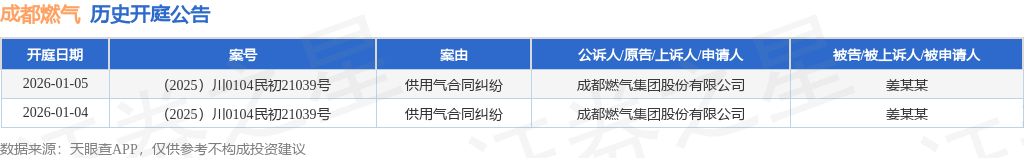 证券之星消息,根据天眼查APP显示,近日公布了一则成都燃气集团股份有限公司作为原告/上诉人的开庭公告,详细内容如下: