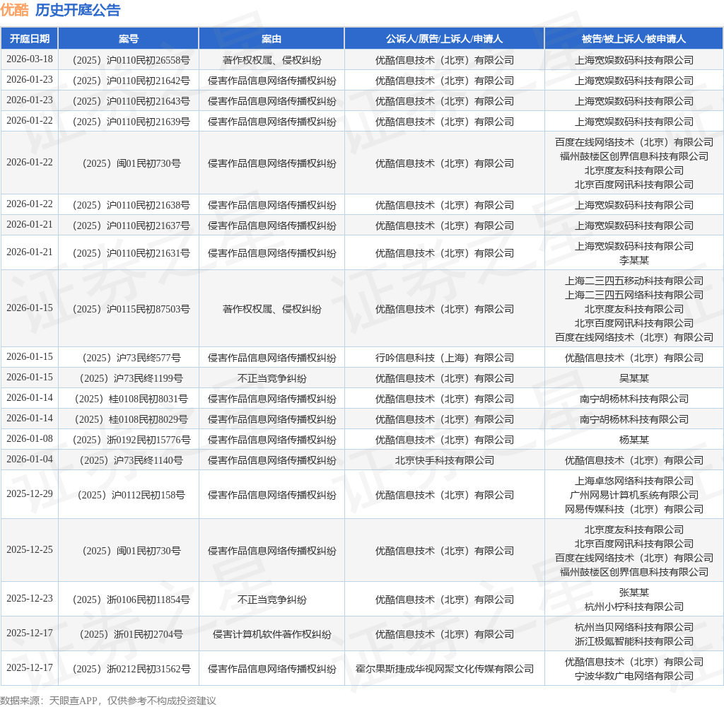 案号:(2025)沪73民终1140号根据统计,近一年内以优酷信息技术(北京)有限公司为当事人的历史开庭公告有216则,其中案由为“侵害作品信息网络传播权纠纷”的公告以141则居首,其次为“不正当竞争纠纷”有25则,“侵害作品信息网络传播权”有11则。历史开庭公告(前20条)如下: