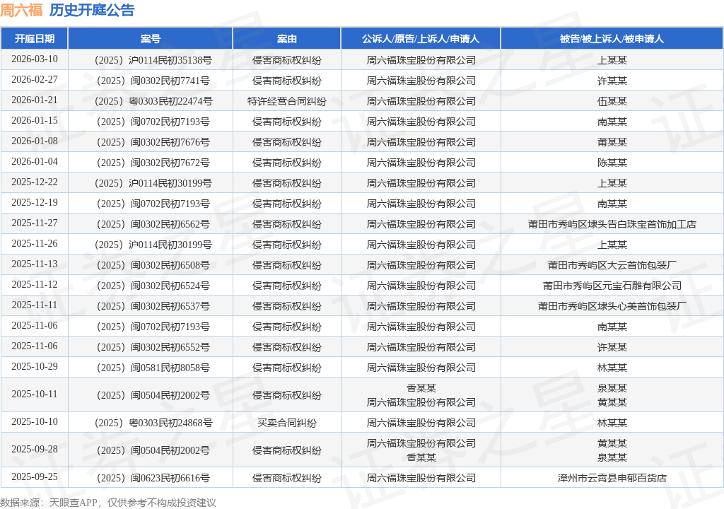 案号:(2025)闽0302民初7672号根据统计,近一年内以周六福珠宝股份有限公司为当事人的历史开庭公告有48则,其中案由为“侵害商标权纠纷”的公告以42则居首,其次为“买卖合同纠纷”有2则,“特许经营合同纠纷”有2则。历史开庭公告(前20条)如下:
