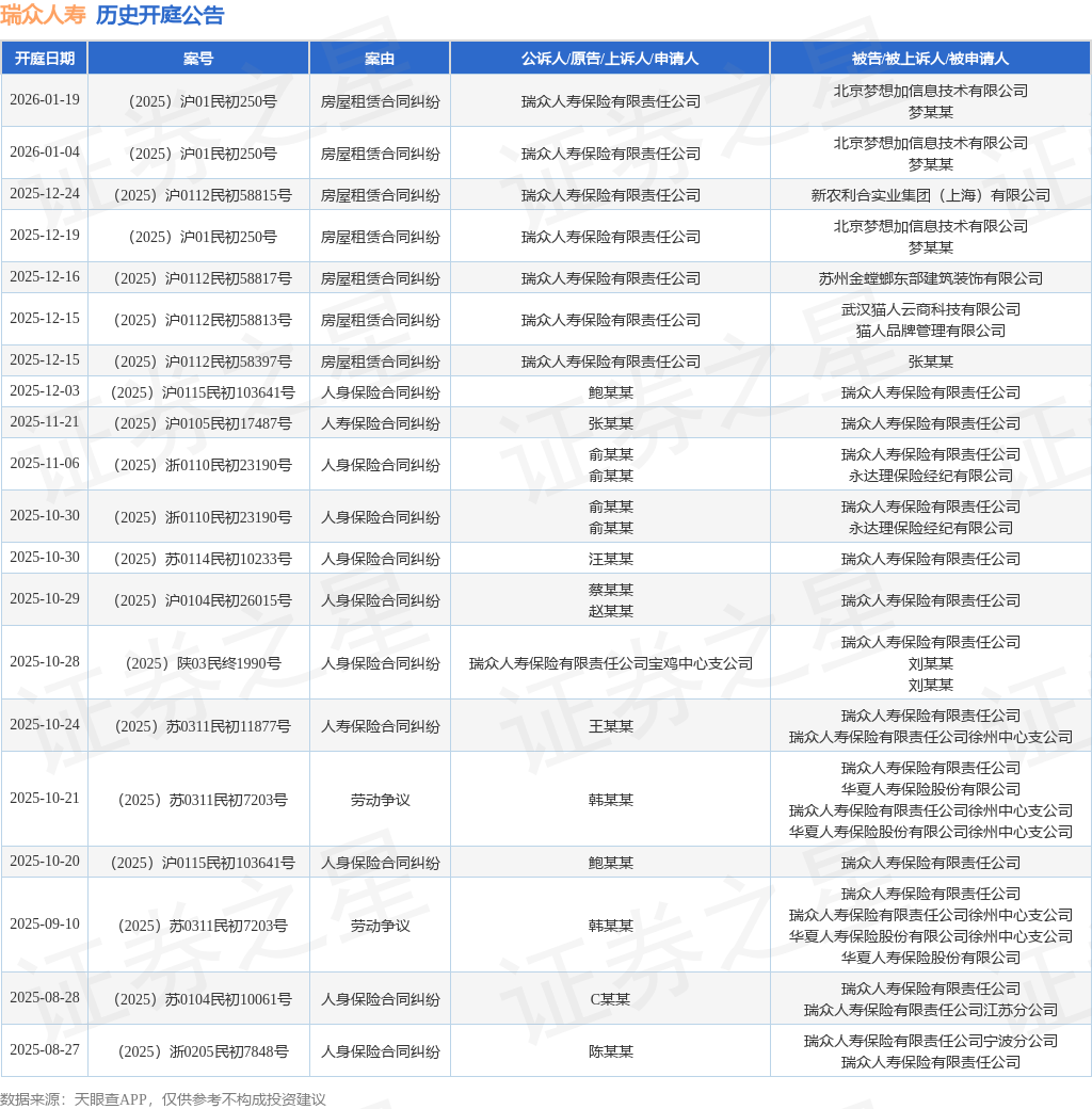 案号:(2025)沪01民初250号根据统计,近一年内以瑞众人寿保险有限责任公司为当事人的历史开庭公告有51则,其中案由为“人身保险合同纠纷”的公告以22则居首,其次为“人寿保险合同纠纷”有7则,“房屋租赁合同纠纷”有7则。历史开庭公告(前20条)如下: