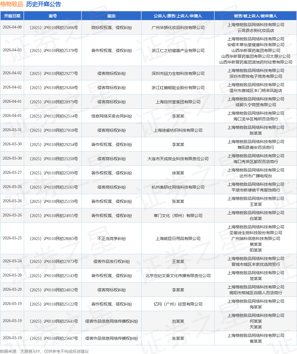 案号:(2025)沪0110民初21760号根据统计,近一年内以上海格物致品网络科技有限公司为当事人的历史开庭公告有3614则,其中案由为“侵害外观设计专利权纠纷”的公告以830则居首,其次为“侵害商标权纠纷”有722则,“著作权权属、侵权纠纷”有561则。历史开庭公告(前20条)如下: