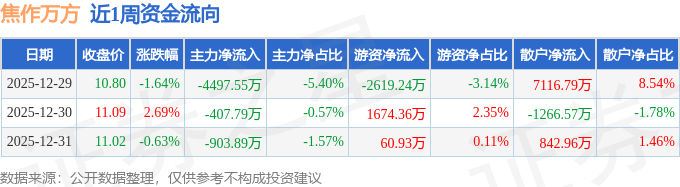 资金流向数据方面,本周焦作万方主力资金合计净流出5809.22万元,游资资金合计净流出883.95万元,散户资金合计净流入6693.17万元。本周资金流向一览见下表: