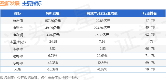 盈新发展(000620)主营业务:文化旅游,规划设计,房地产开发,商业,酒店业,建筑业,物业服务,园林景观,旅游服务。 盈新发展2025年三季报显示,前三季度公司主营收入11.69亿元,同比下降48.38%;归母净利润-4.86亿元,同比下降682.0%;扣非净利润-4.96亿元,同比下降1281.42%;其中2025年第三季度,公司单季度主营收入3.96亿元,同比下降42.46%;单季度归母净利润-3.25亿元,同比下降1027.84%;单季度扣非净利润-3.32亿元,同比下降2413.16%;负债率58.49%,投资收益-89.28万元,财务费用6627.07万元,毛利率6.74%。