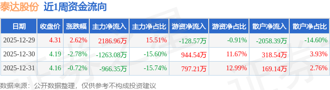 资金流向数据方面,本周泰达股份主力资金合计净流出42.47万元,游资资金合计净流入1613.18万元,散户资金合计净流出1570.71万元。本周资金流向一览见下表: