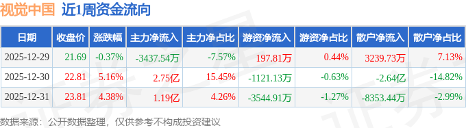 资金流向数据方面,本周视觉中国主力资金合计净流入3.6亿元,游资资金合计净流出4468.23万元,散户资金合计净流出3.15亿元。本周资金流向一览见下表: