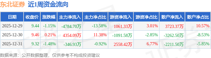 资金流向数据方面,本周东北证券主力资金合计净流出777.54万元,游资资金合计净流入2528.17万元,散户资金合计净流出1750.63万元。本周资金流向一览见下表: