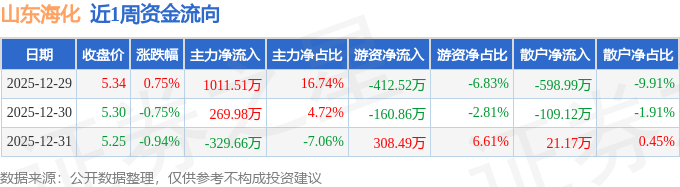 资金流向数据方面,本周山东海化主力资金合计净流入951.83万元,游资资金合计净流出264.89万元,散户资金合计净流出686.94万元。本周资金流向一览见下表: