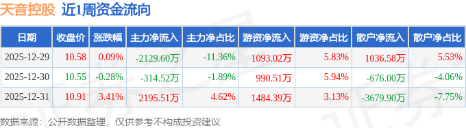 资金流向数据方面,本周天音控股主力资金合计净流出248.6万元,游资资金合计净流入3567.92万元,散户资金合计净流出3319.32万元。本周资金流向一览见下表: