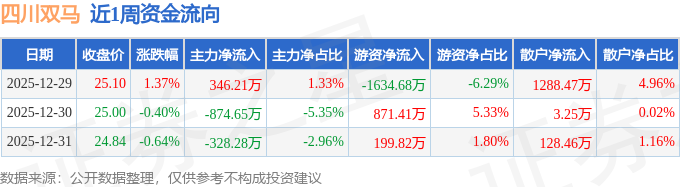 资金流向数据方面,本周四川双马主力资金合计净流出856.72万元,游资资金合计净流出563.45万元,散户资金合计净流入1420.17万元。本周资金流向一览见下表: