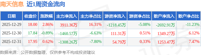 资金流向数据方面,本周南天信息主力资金合计净流入1142.53万元,游资资金合计净流出1052.35万元,散户资金合计净流出90.18万元。本周资金流向一览见下表: