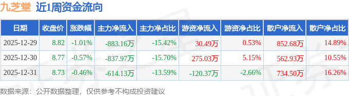 证券之星消息,截至2025年12月31日收盘,九芝堂(000989)报收于8.73元,较上周的8.91元下跌2.02%。本周,九芝堂12月29日盘中最高价报8.9元。12月31日盘中最低价报8.68元。九芝堂当前最新总市值74.72亿元,在中药板块市值排名32/67,在两市A股市值排名2471/5181。