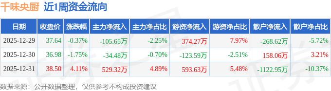 资金流向数据方面,本周千味央厨主力资金合计净流入389.19万元,游资资金合计净流入844.32万元,散户资金合计净流出1233.51万元。本周资金流向一览见下表: