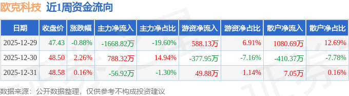 资金流向数据方面,本周欧克科技主力资金合计净流出937.42万元,游资资金合计净流入260.06万元,散户资金合计净流入677.37万元。本周资金流向一览见下表: