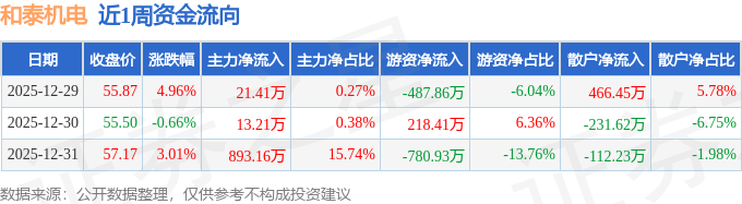 资金流向数据方面,本周和泰机电主力资金合计净流入927.77万元,游资资金合计净流出1050.38万元,散户资金合计净流入122.61万元。本周资金流向一览见下表: