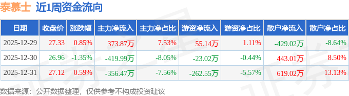 资金流向数据方面,本周泰慕士主力资金合计净流出402.59万元,游资资金合计净流出230.42万元,散户资金合计净流入633.02万元。本周资金流向一览见下表: