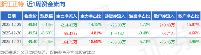 资金流向数据方面,本周浙江正特主力资金合计净流入5.76万元,游资资金合计净流出223.44万元,散户资金合计净流入217.68万元。本周资金流向一览见下表: