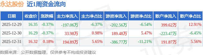 资金流向数据方面,本周永达股份主力资金合计净流入31.82万元,游资资金合计净流出399.84万元,散户资金合计净流入368.02万元。本周资金流向一览见下表: