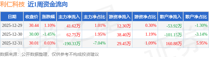 资金流向数据方面,本周利仁科技主力资金合计净流出85.96万元,游资资金合计净流入80.15万元,散户资金合计净流入5.81万元。本周资金流向一览见下表: