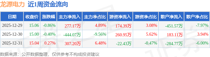 资金流向数据方面,本周龙源电力主力资金合计净流入140.3万元,游资资金合计净流入412.92万元,散户资金合计净流出553.22万元。本周资金流向一览见下表: