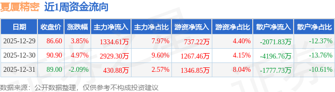 资金流向数据方面,本周夏厦精密主力资金合计净流入4694.79万元,游资资金合计净流入3351.53万元,散户资金合计净流出8046.32万元。本周资金流向一览见下表: