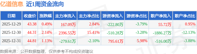 资金流向数据方面,本周亿道信息主力资金合计净流入2284.02万元,游资资金合计净流入62.53万元,散户资金合计净流出2346.55万元。本周资金流向一览见下表: