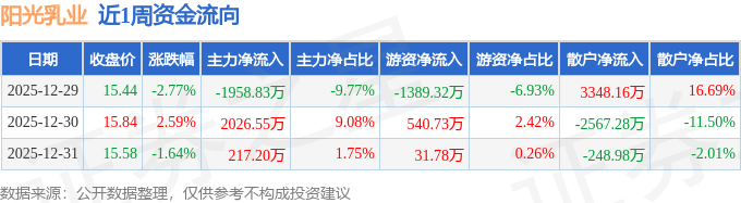 资金流向数据方面,本周阳光乳业主力资金合计净流入284.91万元,游资资金合计净流出816.81万元,散户资金合计净流入531.9万元。本周资金流向一览见下表:
