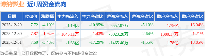 资金流向数据方面,本周博纳影业主力资金合计净流出2.66亿元,游资资金合计净流出1.0亿元,散户资金合计净流入3.66亿元。本周资金流向一览见下表: