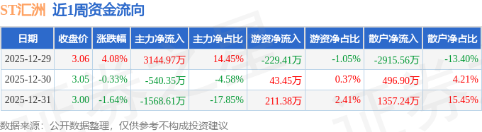 沪深股通持股方面,截止2025年12月31日收盘,ST汇洲深股通持股数为1974.65万股,占流通股比为99.0%。