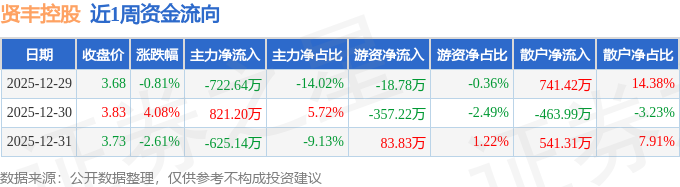资金流向数据方面,本周贤丰控股主力资金合计净流出526.57万元,游资资金合计净流出292.17万元,散户资金合计净流入818.74万元。本周资金流向一览见下表: