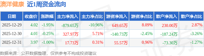 证券之星消息,截至2025年12月31日收盘,澳洋健康(002172)报收于3.97元,较上周的4.1元下跌3.17%。本周,澳洋健康12月29日盘中最高价报4.1元。12月31日盘中最低价报3.94元。澳洋健康当前最新总市值30.4亿元,在医疗服务板块市值排名47/51,在两市A股市值排名4511/5181。
