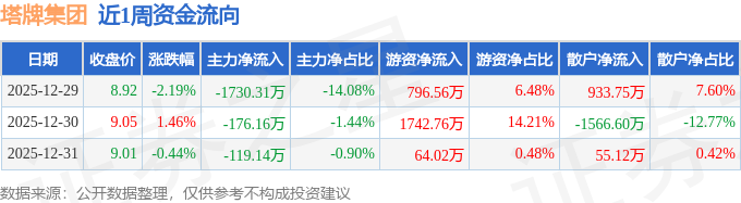 资金流向数据方面,本周塔牌集团主力资金合计净流出2025.61万元,游资资金合计净流入2603.33万元,散户资金合计净流出577.73万元。本周资金流向一览见下表: