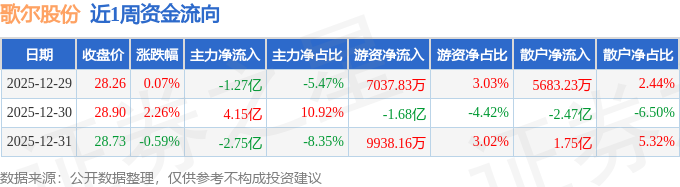 资金流向数据方面,本周歌尔股份主力资金合计净流入1345.6万元,游资资金合计净流入185.1万元,散户资金合计净流出1530.7万元。本周资金流向一览见下表: