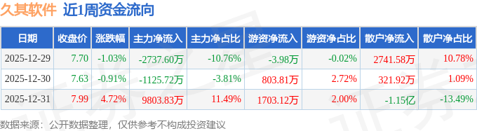 资金流向数据方面,本周久其软件主力资金合计净流入5940.51万元,游资资金合计净流入2502.95万元,散户资金合计净流出8443.45万元。本周资金流向一览见下表: