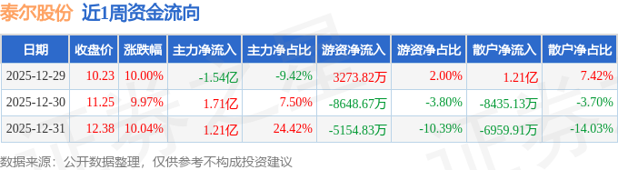 资金流向数据方面,本周泰尔股份主力资金合计净流入1.38亿元,游资资金合计净流出1.05亿元,散户资金合计净流出3246.89万元。本周资金流向一览见下表:
