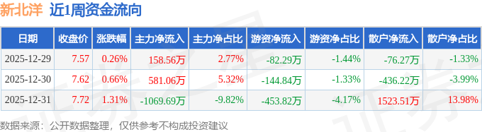 资金流向数据方面,本周新北洋主力资金合计净流出330.07万元,游资资金合计净流出680.95万元,散户资金合计净流入1011.02万元。本周资金流向一览见下表: